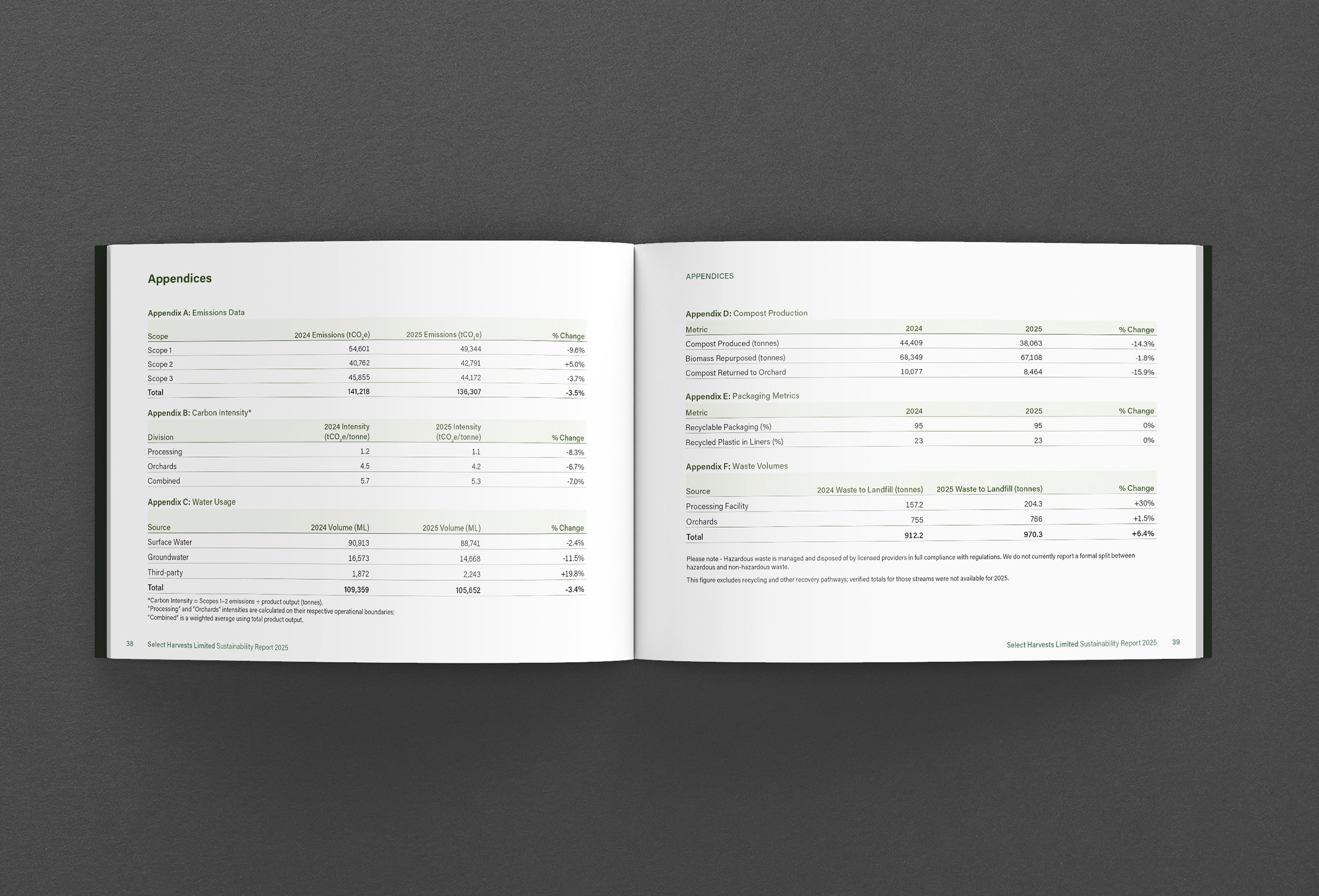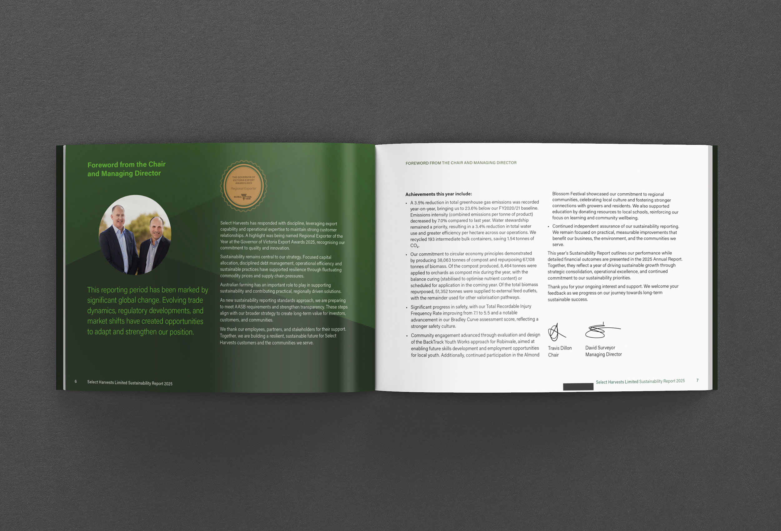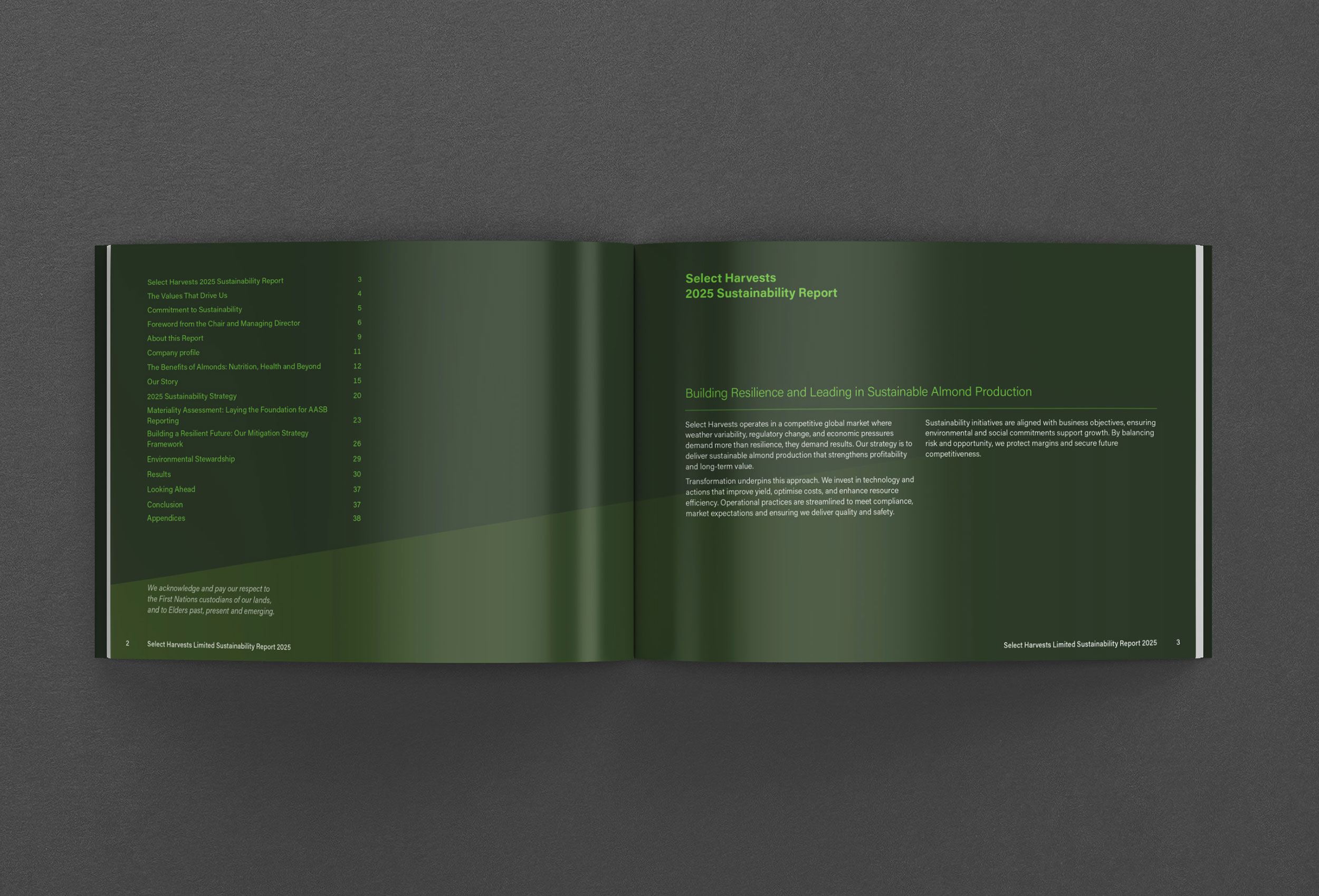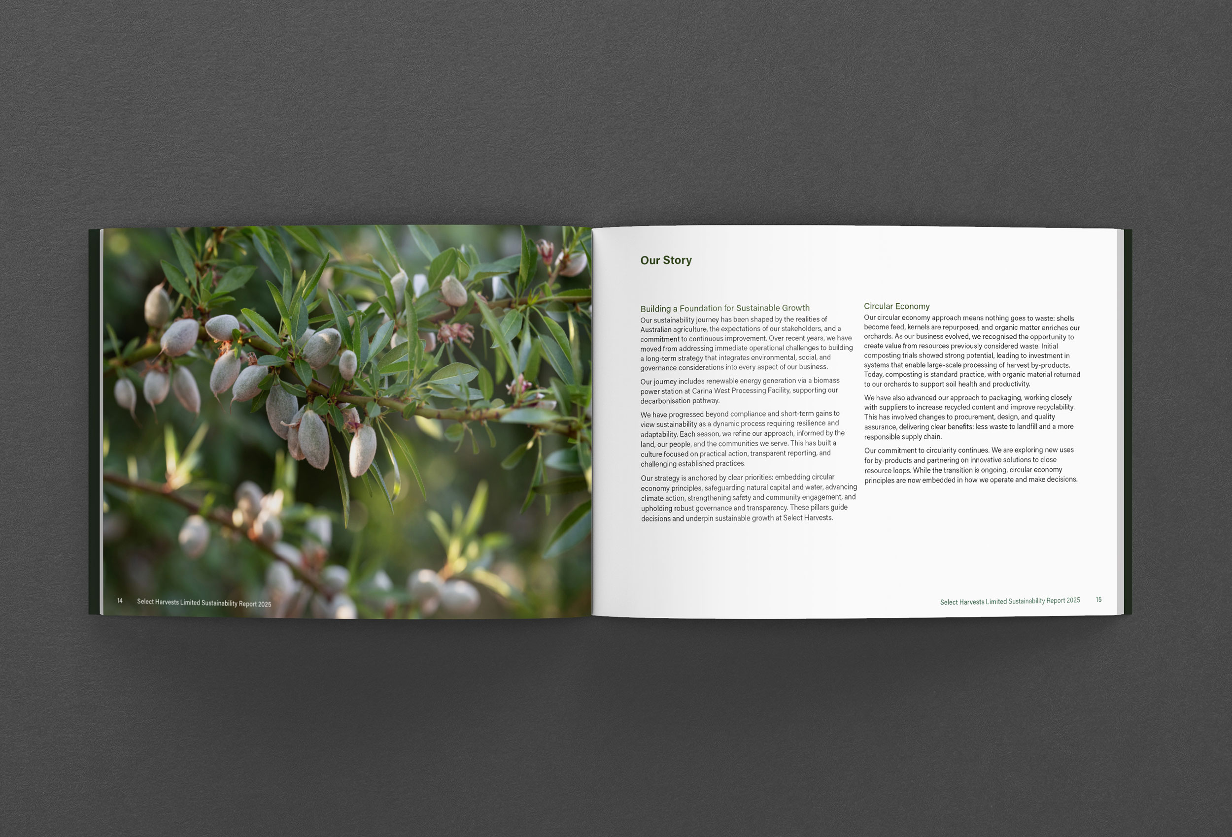 The A5 size landscape format report differentiates from the 2025 portrait format Annual Report. The powerful cover concept is a logical transition from 2023 with a focus on the harvesting process. We commissioned photography to show the scale of the operations and to illustrate the continuous improvement across all areas of sustainability. We designed a strong and consistent colour palette, legible typography and graphics to elevate the brand identity throughout the report. The report is printed and available online.